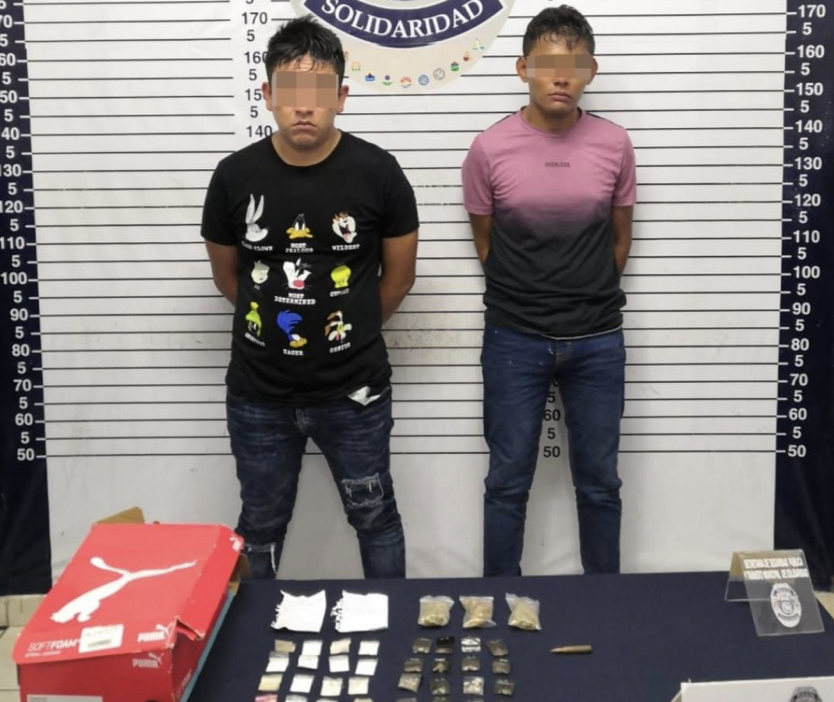 Mientras realizaban un recorrido de vigilancia para la prevención del delito, policías de la Secretaría de Seguridad Pública y Tránsito Municipal aseguraron a dos sujetos en posesión de 38 dosis de posibles narcóticos en la Quinta avenida.