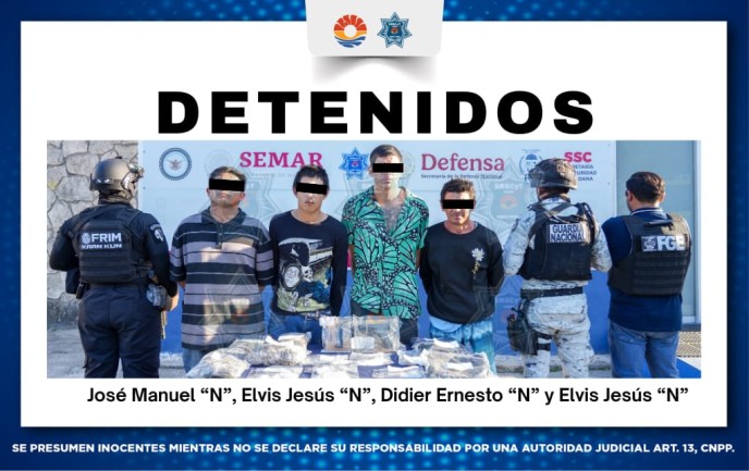 En el marco del operativo “Blindaje Cancún”, autoridades de los tres órdenes de gobierno lograron la detención de cuatro personas del sexo masculino, presuntamente relacionadas con delitos contra la salud en su modalidad de narcomenudeo.
