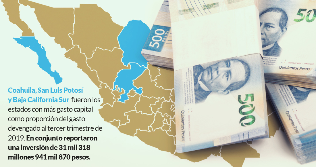 Entre los estados con mayor gasto capital como proporción del gasto devengado al tercer trimestre de 2019 estuvieron Coahuila (80 por ciento), San Luis Potosí (62 por ciento) y Baja California Sur (57 por ciento), que reportaron una inversión conjunta por 31 mil 318 millones 941 mil 870 pesos.