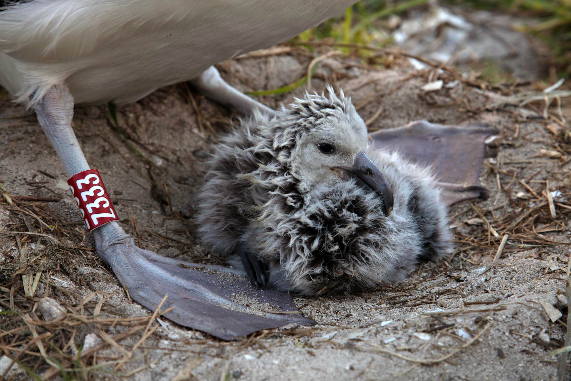 Wisdom, una hembra de albatros de Laysan que tiene por lo menos 70 años, tuvo un polluelo en el Refugio Nacional de Vida Silvestre del Atolón Midway, en Hawái.