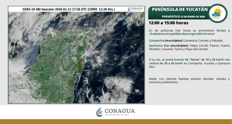 De acuerdo con el pronóstico del Servicio Meteorológico Nacional, en las próximas tres horas se prevé la presencia de lluvias y chubascos acompañados de posibles descargas eléctricas en los municipios de Felipe Carrillo Puerto, Puerto Morelos, Cozumel, Tulum y Playa del Carmen.