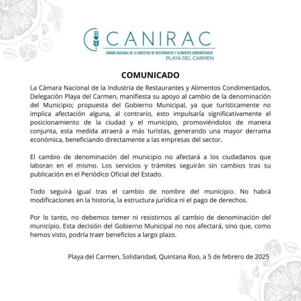 La Asociación de Hoteles de la Riviera Maya y la Cámara de la Industria Restaurantera y Alimentos Condimentados (CANIRAC) manifestaron su total respaldo al Gobierno Municipal en la propuesta de cambiar el nombre del municipio de Solidaridad a Playa del Carmen.