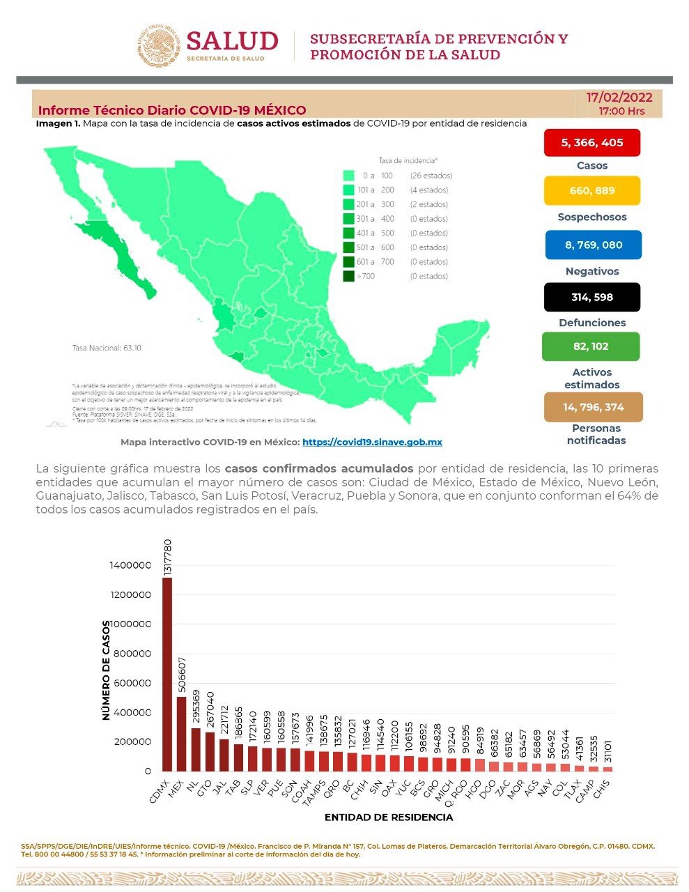 De acuerdo con el reporte técnico de la Secretaría de Salud, al corte de este miércoles 16 de febrero, el país sumó 5 millones 366 mil 405 casos positivos y 314 mil 598 muertes por esta enfermedad.