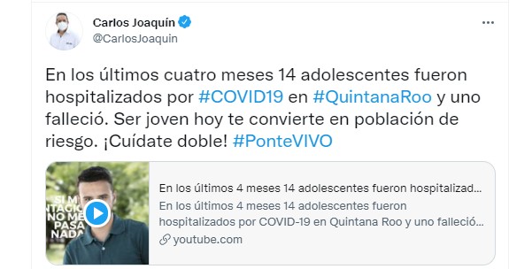 «En los últimos cuatro meses 14 adolescentes fueron hospitalizados por #COVID19 en #QuintanaRoo y uno falleció. Ser joven hoy te convierte en población de riesgo», compartió en redes sociales el mandatario estatal.