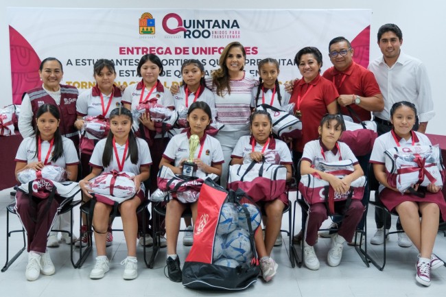 La gobernadora Mara Lezama Espinosa, encabezó la entrega de uniformes a 25 participantes que ganaron la etapa estatal del “Torneo Nacional de Fútbol Escolar FMF” y quienes representarán a Quintana Roo en la competencia nacional a celebrarse del 9 al 13 de junio en la Ciudad de Toluca, Estado de México.