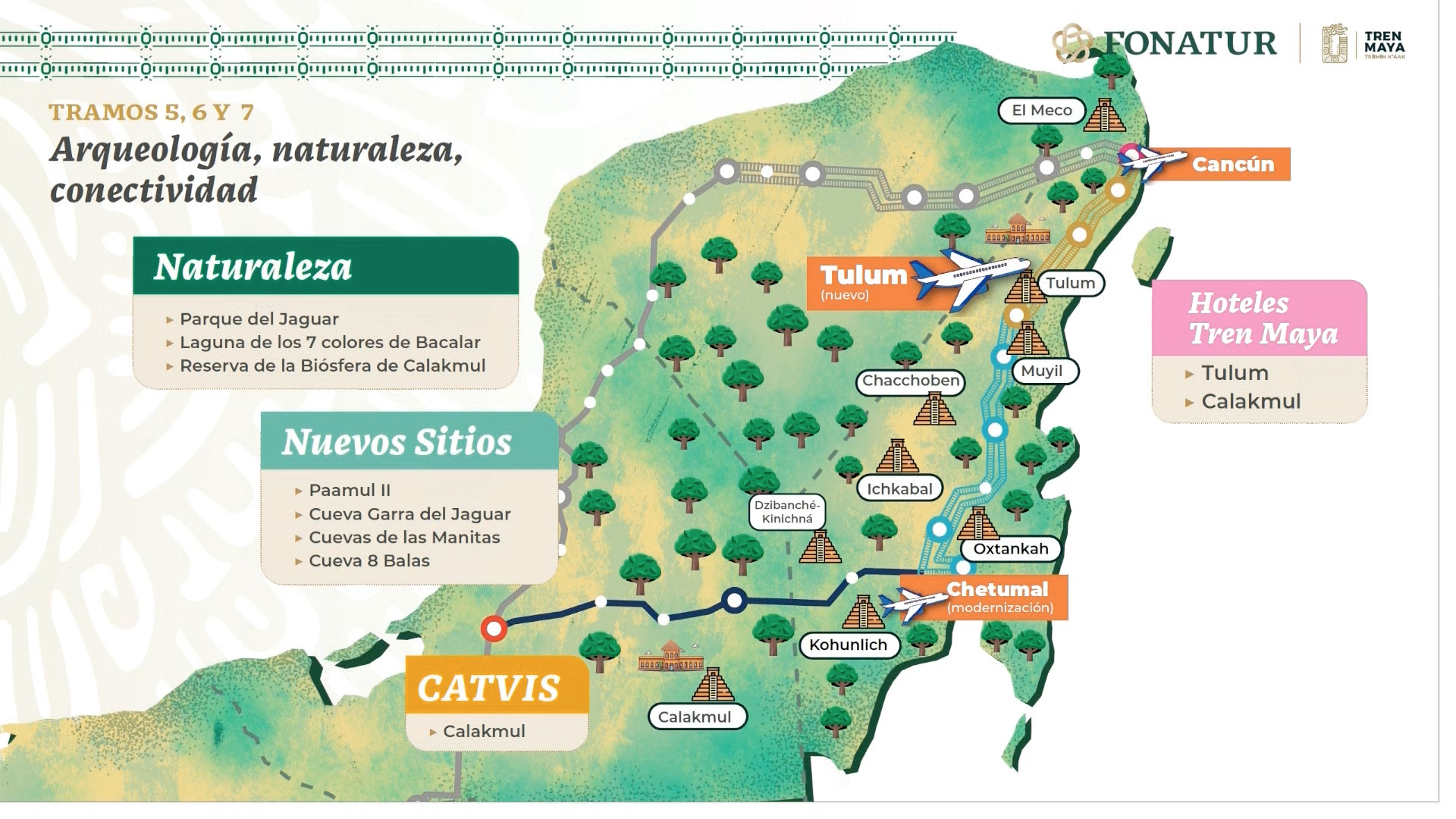 Además, de que en el Tramo 6, que va de Tulum a Chetumal, son 255.8 kilómetros y de Chetumal a Escárcega, Campeche, se edificarán 254.5 kilómetros, correspondiente al Tramo 7.