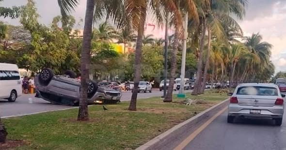 El exceso de velocidad y la imprudencia al volante provocaron una volcadura en la zona hotelera de Cancún, a la altura de playa Las Perlas, sobre el bulevar Kukulcán.