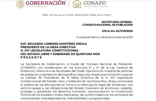 A través del Consejo Nacional de Población (Conapo), la Secretaria de Gobernación realizó un llamado a la XVI Legislatura del Congreso del Estado para que se inicie el análisis de las discusiones en torno a la interrupción legal del embarazo en Quintana Roo.