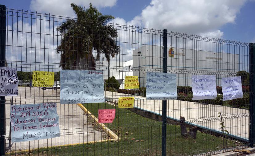 Docentes se manifestaron ayer en las oficinas de la Secretaría de Educación de Quintana Roo (SEQ) en la zona norte para exigir una respuesta a la solicitud de prórroga en el proceso de asignación de plazas, sin la cual podrían perder su derecho laboral.