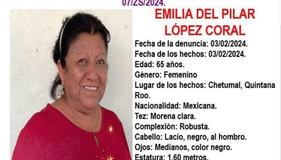 La Fiscalía General del Estado (FGE) activó la ficha de búsqueda para localizar a Emilia del Pilar López Coral, de 65 años de edad y vista por última vez en la capital del Estado, quien fue levantada por sujetos fuertemente armados que llegaron hasta la tienda donde trabajaba y se la llevaron.