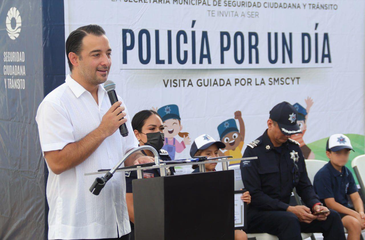 A fin de promover una cultura de paz desde la infancia, el Encargado de Despacho de la Presidencia Municipal de Benito Juárez, Pablo Gutiérrez Fernández, convivió con más de 50 niñas y niños de la primaria “Luis Fernando Cervera Cortés”, que participaron en el programa “Policía por un día”, que incluye una visita guiada en las instalaciones de la Secretaría Municipal de Seguridad Ciudadana y Tránsito, para que conozcan las funciones y a los elementos de la corporación.