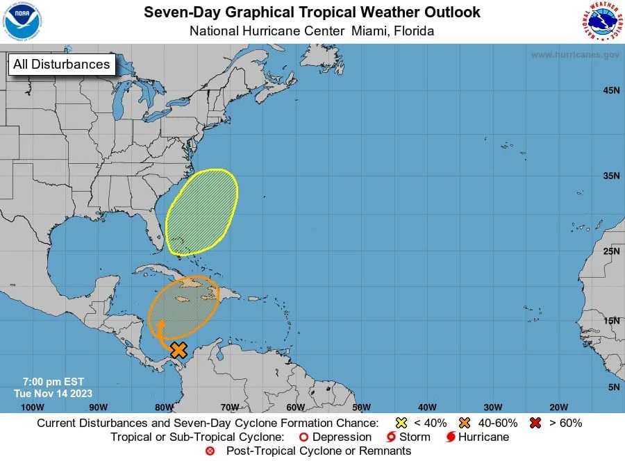 Se prevé la formación de una zona de baja presión al este de las costas de Florida, E.U.A. Presenta 10% de probabilidad para desarrollo ciclónico en 7 días.