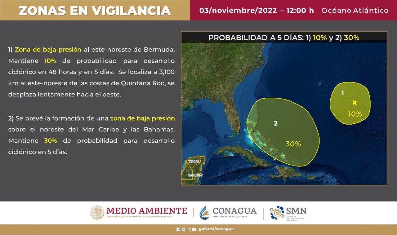 La gobernadora de Quintana Roo, Mara Lezama Espinoza anunció que continúa el proceso de monitoreo de zonas de inestabilidad que podrían evolucionar a ciclones tropicales, el primero al este noreste de Bermuda, y el segundo al noreste del Mar Caribe.