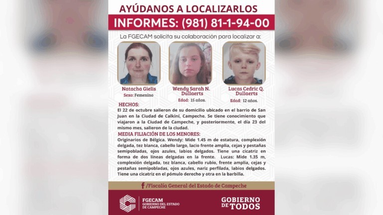 La Fiscalía General del Estado de Campeche informó la localización de la familia de origen belga que había sido reportada como no localizada. En coordinación con la Fiscalía General del Estado de Quintana Roo, se logró ubicar a la ciudadana Natacha Gielis y a sus hijos Wendy Sarah y Lucas Cedric Dullaerts, quienes fueron hallados en buen estado de salud y permanecen bajo resguardo de las autoridades quintanarroenses.