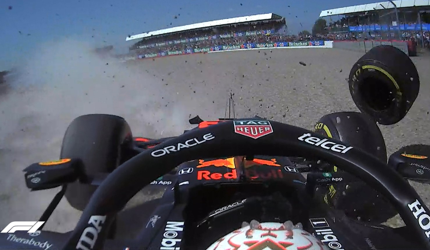 Pero en Copse, la novena de las 18 del circuito de Silverstone, el Mercedes del inglés se tocó con el neumático trasero derecho del Red Bull del neerlandés; que se estrelló, por fortuna sin mayores consecuencias físicas, contra las barreras de protección.