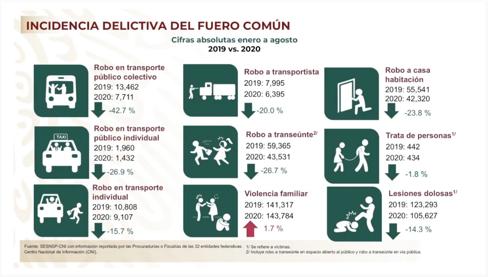 En el mes de agosto se registró una ligera baja en el delito de homicidio doloso en México, el cual fue 0.46% inferior respecto a julio de 2020, informó Alfonso Durazo Montaño, titular de la Secretaría de Seguridad y Protección Ciudadana (SSPC).