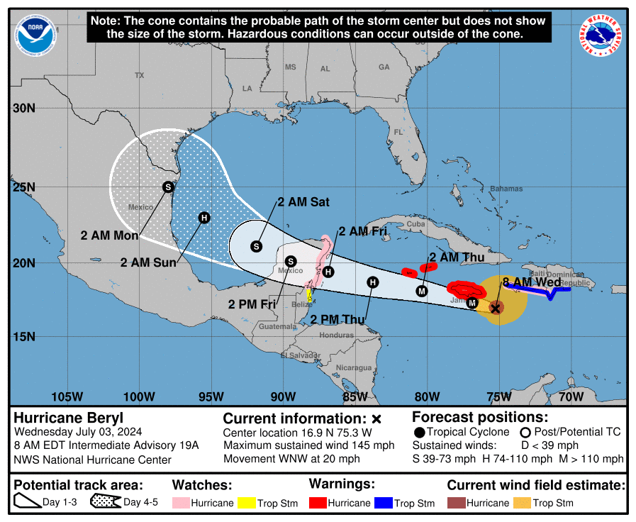Sin embargo, se pronostica que Beryl estará en o cerca de la intensidad de huracán mayor mientras pasa cerca de Jamaica más tarde hoy y las Islas Caimán esta noche o temprano el jueves.