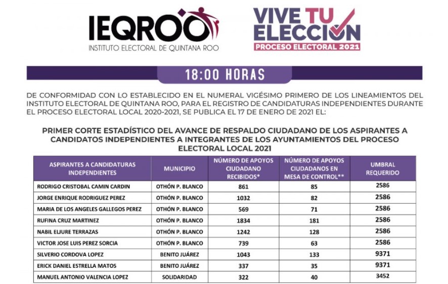 Chetumal.-De acuerdo al primer corte del Instituto Electoral de Quintana Roo(IEQROO) sobre el conteo de avance de firmas de respaldo ciudadano hacia los 9 aspirantes, emitido a las 18:00 hrs., de este 17 de enero, de este Proceso Ordinario 2020-2021, los pre candidatos avanzan progresivamente en este primer “candado” para conseguir y hasta rebasar el 1.5% del padrón electoral municipal a efecto de aparecer en la papeleta electoral.