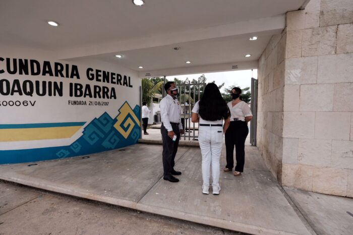 En el inicio del ciclo escolar 2021-2022, la secundaria “Nassim Joaquín Ibarra” que se localiza en la región 250 de Cancún, se convirtió esta mañana en una de las primeras escuelas en recibir alumnos para que reciban clases en la modalidad presencial.