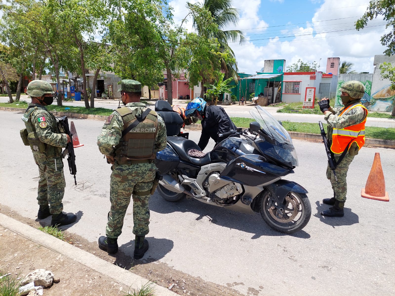 Debido al incremento de delitos de alto impacto en las súpermanzanas colindantes al arco norte, la Guardia Nacional junto con la Secretaría de la Defensa Nacional realizan un operativo de inspección aleatoria en las inmediaciones del fraccionamiento Las Palmas en Cancún.