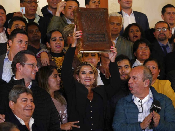 Tras autoproclamarse mandataria interina, Áñez ingresó al viejo Palacio de Gobierno con una Biblia en la mano, aunque nadie le tomó juramento. Una vez ahí pidió un minuto de silencio para los cuatro muertos durante las protestas y llamó a las Fuerzas Armadas a ayudar a pacificar el país.