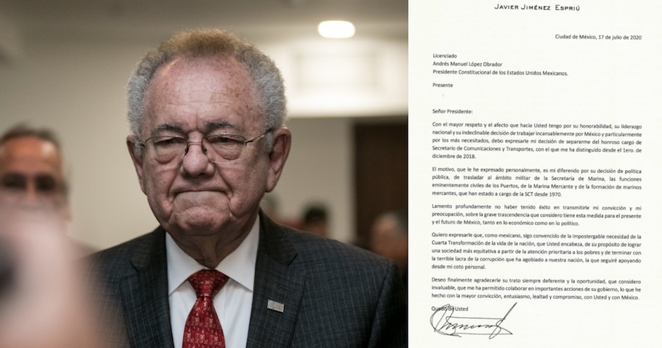 Ciudad de México, (SinEmbargo).– En la carta con la que renunció a la titularidad de la Secretaría de Comunicaciones y Transportes (SCT), Javier Jiménez Espriú le dijo al Presidente Andrés Manuel López Obrador que no está de acuerdo en darle más poder a la Secretaría de Marina.