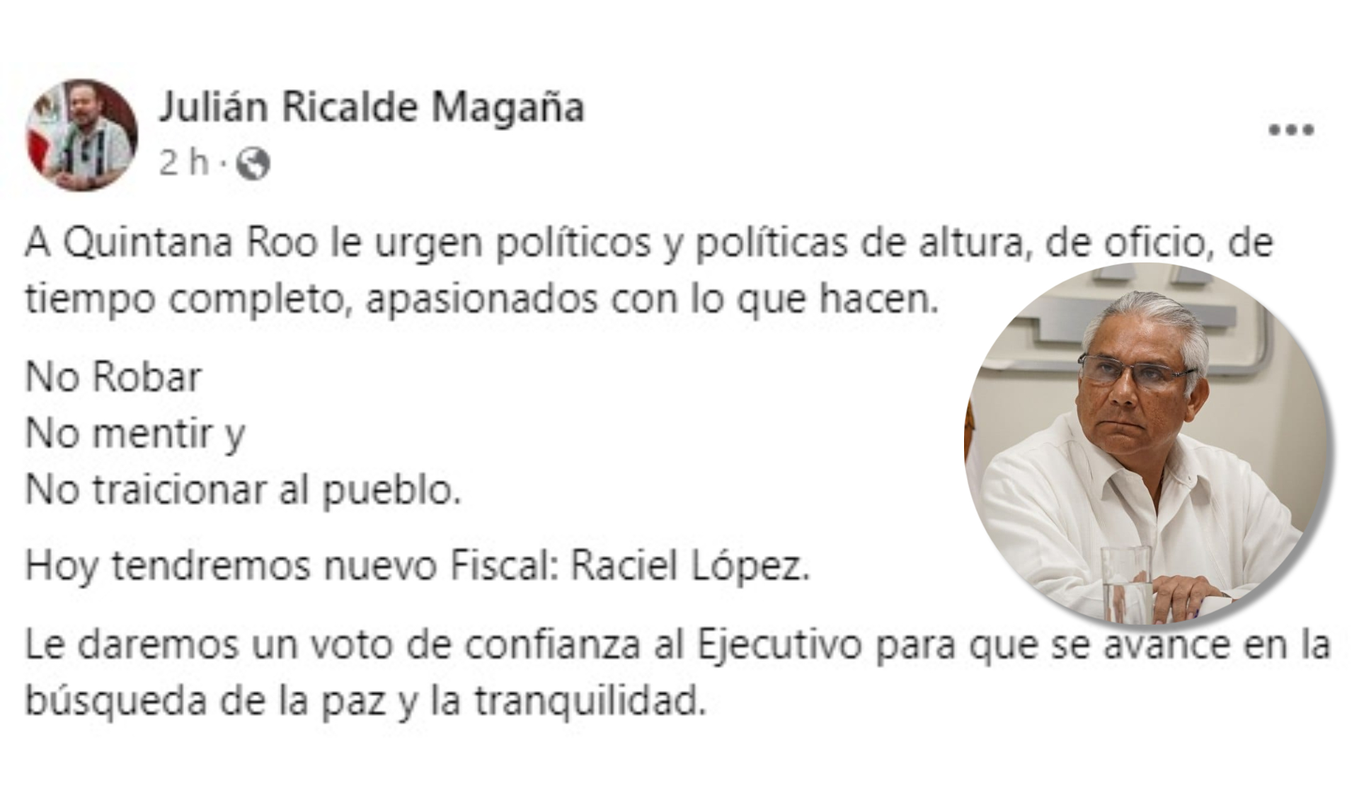 El diputado Julián Ricalde Magaña causó revuelo tras una polémica declaración que hizo en sus redes sociales, en la que adelantó que el Doctor Raciel López Salazar, actual Fiscal interino, será ratificado como nuevo Fiscal General de Quintana Roo.