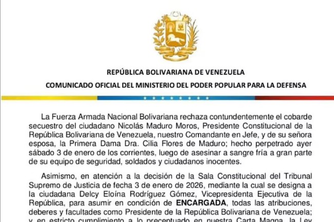 El Ministro de la Defensa, GJ (Ej) Vladimir Padrino López dijo a través de un reciente y escueto comunicado que la Fuerza Armada rechaza “el cobarde secuestro” de Nicolás Maduro Moros y Cilia Flores, destacando que fue “luego de asesinar a sangre fría a gran parte de su equipo de seguridad, soldados y ciudadanos inocentes”, pero sin señalar la cantidad ni los nombres de los fallecidos.