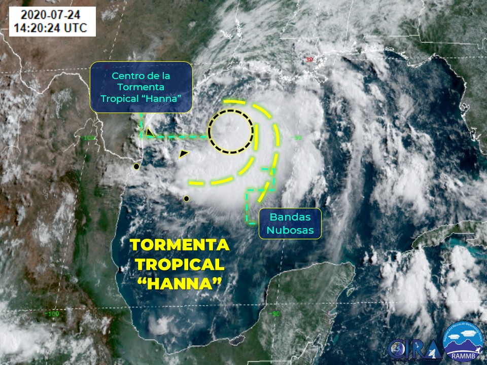 El Servicio Meteorológico Nacional informa que la Tormenta Tropical «Hanna», se localiza a 475 km al este-noreste de Barra el Mezquital, Tamps. y a 420 km al este de Corpus Christi, Texas, E.U.A.