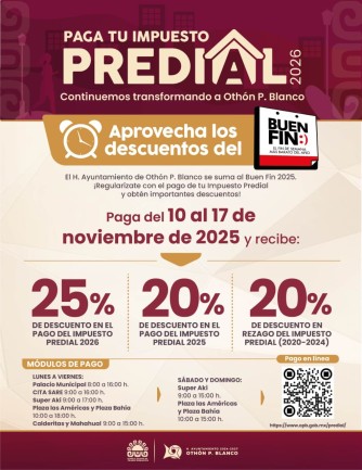 Con el objetivo de cuidar la economía familiar y fortalecer la recaudación para avanzar con la Transformación de Othón P. Blanco, se aplicará un descuento del 25% en el pago del Impuesto Predial del 2026.