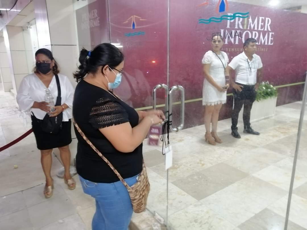 Representantes de los medios de comunicación que fueron a cubrir el primer informe de resultados de Yensunni Martínez, presidenta municipal de Othón P. Blanco, fueron recibidos con las puertas cerradas, al sorprenderse de que les negaron el acceso al área del recinto.