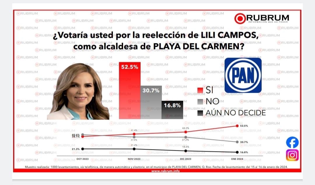 Datos de Rubrum, colocan a Lili Campos como la favorita para ganar nuevamente la Presidencia Municipal de Solidaridad; el 52.2% de la ciudadanía del mismo municipio ya decidió y es por la panista.