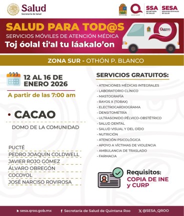 Chetumal- Con el objetivo de acercar la atención médica a la población, durante la semana del 12 al 16 de enero las caravanas móviles del programa “Salud para Tod@s” recorrerán diversas comunidades, brindando servicios de salud totalmente gratuitos para niñas, niños, adultos y personas de la tercera edad.