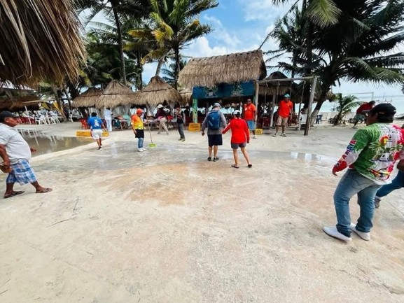 De igual manera con escobas y algunas herramientas, es el personal del área de restaurantes, los que barrieron y limpiaron las orillas donde se acumula la arena, con la finalidad de que el agua fluya y sea absorbida por la arena.