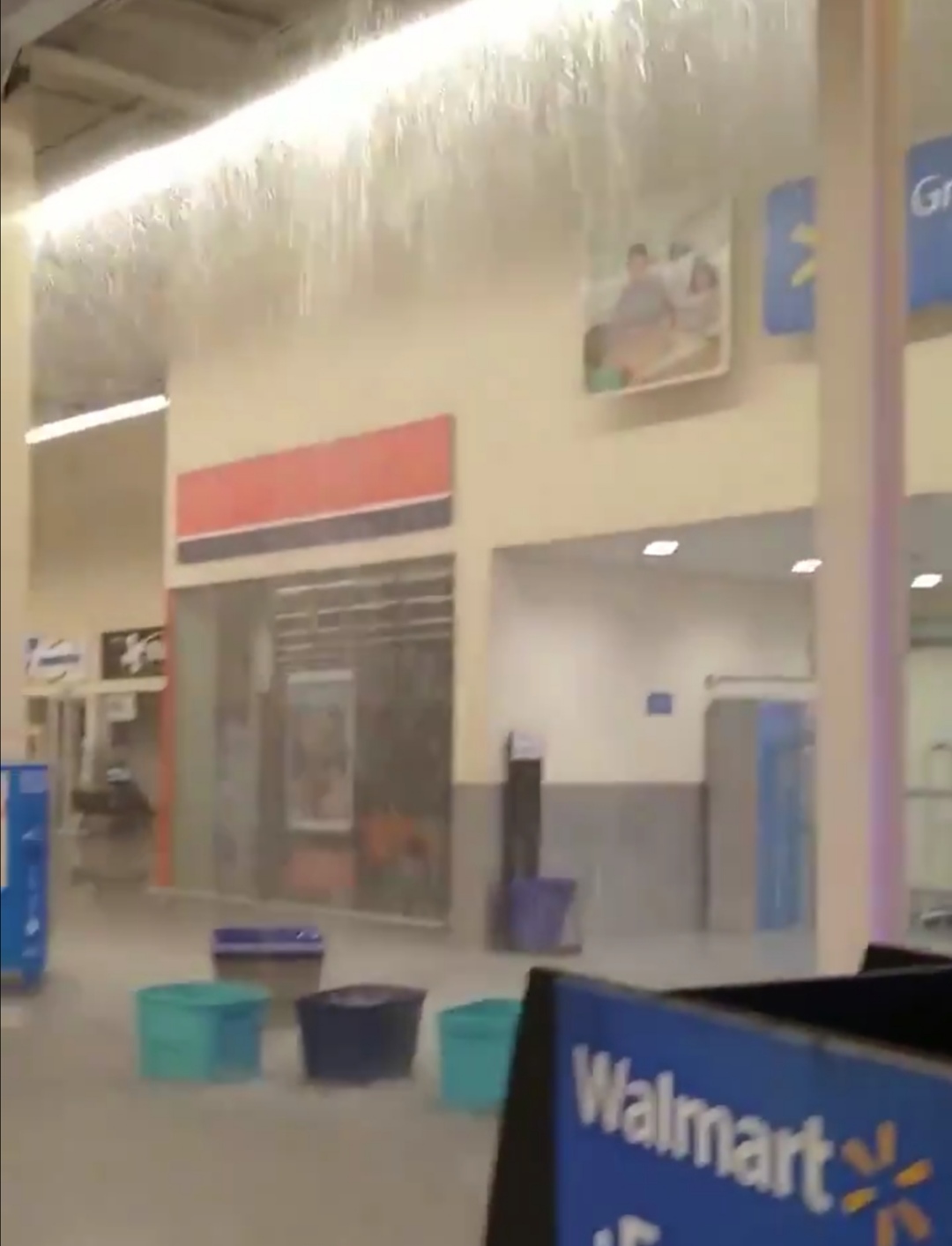 Un video difundido en redes sociales muestra el momento en que los empleados del Walmart intentan evitar que el agua inunde la tienda barriéndola hacia la salida.