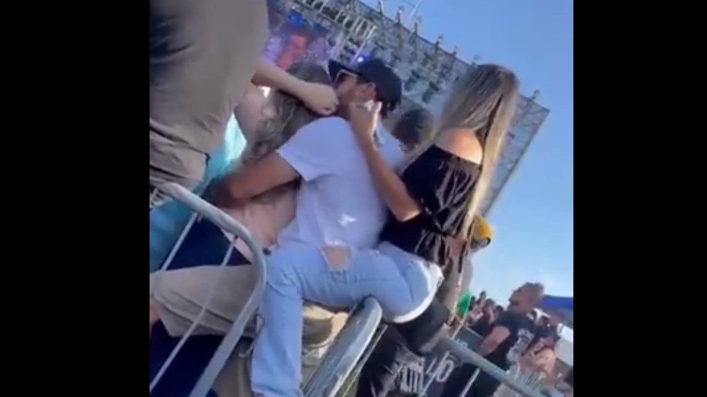 Lo peor es que lo hace casi en las narices, o más bien, espaldas, de la novia. Y es que el trío está en lo que parece ser un concierto, donde la joven es abrazada por su novio y su mamá está sentada atrás sobre una valla.