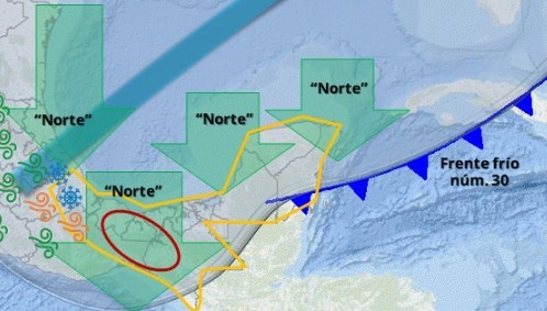 El frente frío núm. 30 se desplazará sobre el sur del golfo de México, sureste del país y la península de Yucatán, propiciando lluvias fuertes a muy fuertes en dichas regiones; pronosticándose lluvias puntuales intensas a torrenciales en Veracruz, Oaxaca y Chiapas.