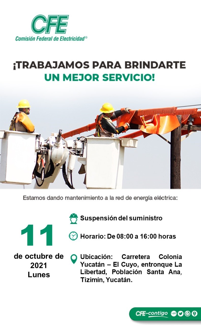 En Yucatán, el suministro eléctrico se cortará en la comisaría Dzununcán, en Benito Juárez Oriente, en Circuito Colonias y García Ginerés en Mérida, así como en la población Santa Ana, en Tizimín.