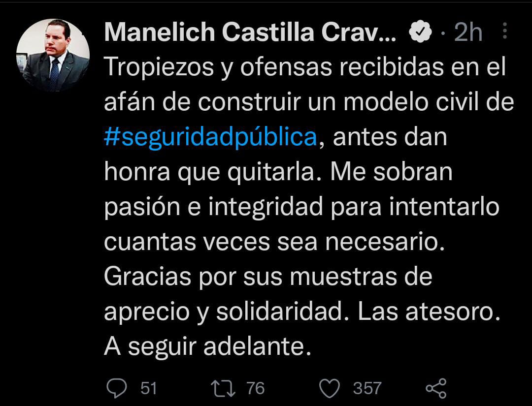 “Tropiezos y ofensas recibidas en el afán de construir un modelo civil de #seguridadpública, antes dan honra que quitarla. Me sobran pasión e integridad para intentarlo cuantas veces sea necesario. Gracias por sus muestras de aprecio y solidaridad. Las atesoro. A seguir adelante”, comentó a través de su cuenta Twitter.
