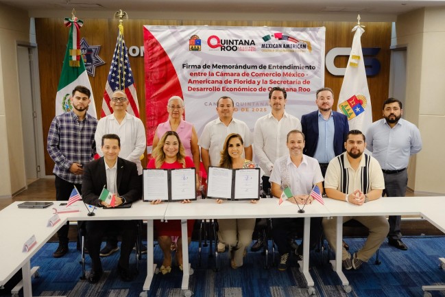 Este memorándum, firmado entre la Cámara de Comercio México-Americana de Florida, ante la presencia de la Presidenta y CEO Alma Aguilar, con la Secretaría de Desarrollo Económico, permitirá consolidar una alianza estratégica binacional para promover la internalización de empresas quintanarroenses en Florida, mediante impulso a la oferta exportable de productos locales.