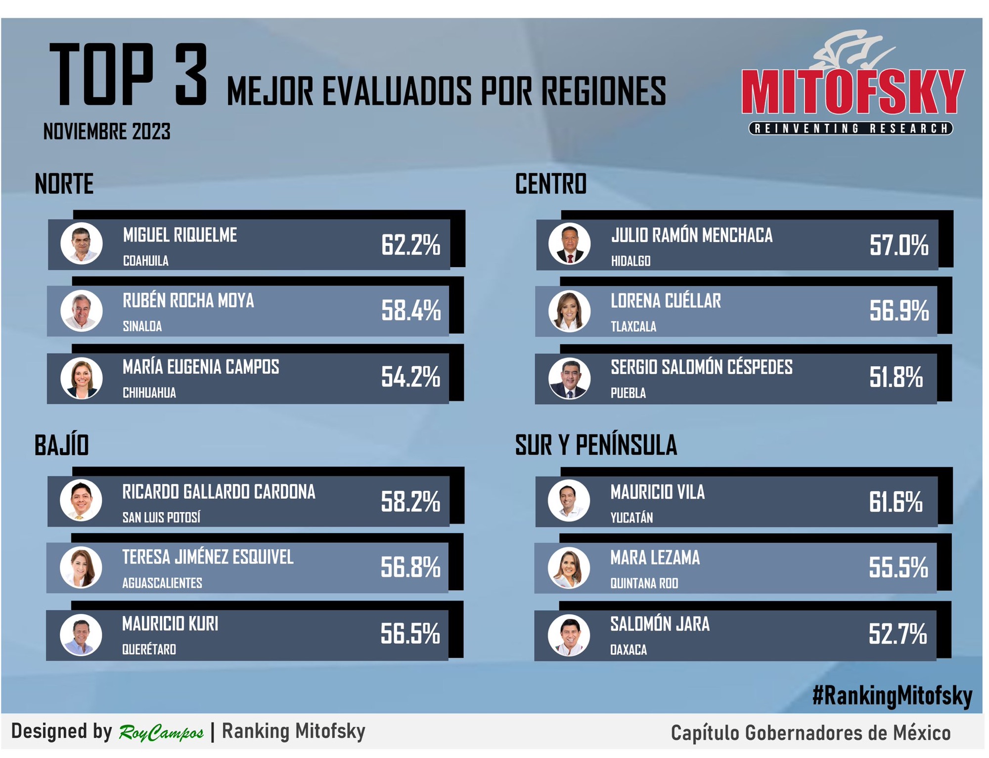 Mientras tanto, Mara Lezama Espinosa solo fue superada por el gobernador de Yucatán, Mauricio Aviña Dosal y quedando arriba de Salomón Jara, gobernador de Oaxaca.