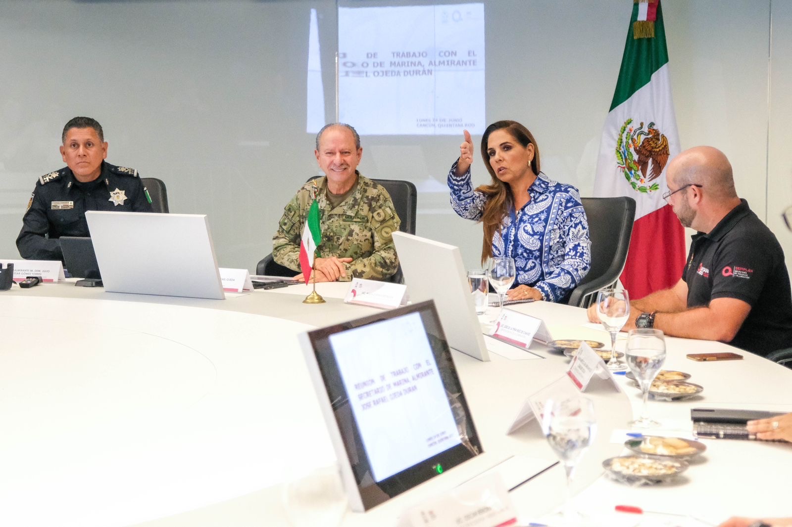 El Almirante Ojeda Durán y la Gobernadora Mara Lezama trabajaron en las instalaciones del complejo de seguridad C5 en donde se reiteró que México es el único país donde los 3 niveles de gobierno trabajan de manera coordinada, gobierno del Estado, la Secretaría de Marina y Gobierno de México.