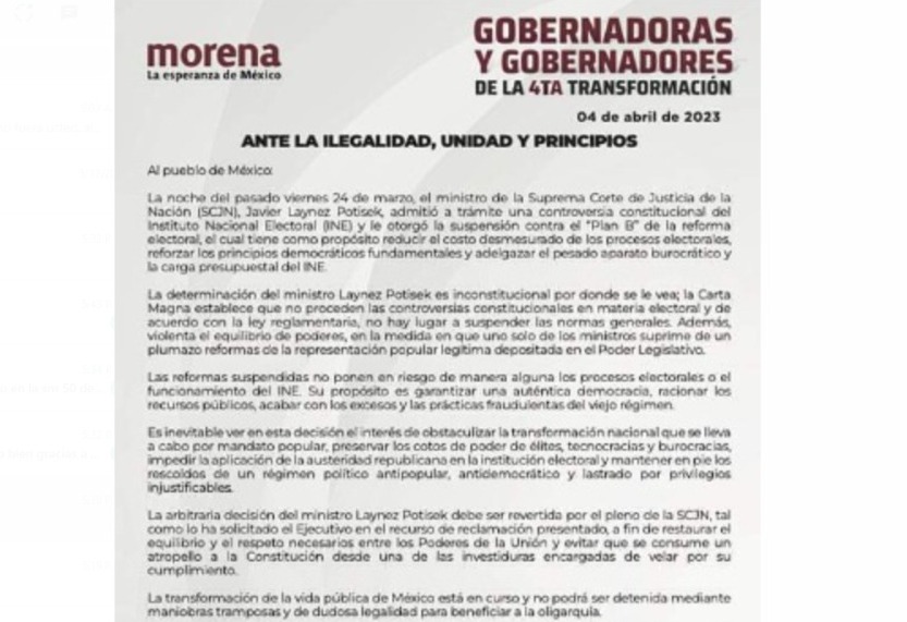 Mara Lezama Espinosa, gobernadora de Quintana Roo y sus homólogos de Morena de otros 22 estado de la República Mexicana, así como sus partidos aliados, firmaron un desplegado para exigir a la Suprema Corte de Justicia de la Nación (SCJN) que se revierta la “arbitraria decisión” del ministro Javier Leynez Potisek, de frenar el llamado “Plan B” de Reforma Electoral.