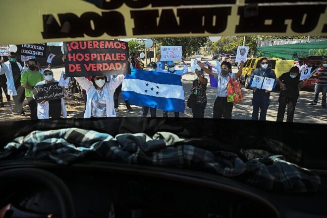 “Cese al genocidio contra el personal de salud”, decía una de las pancartas de unos 300 miembros del Colegio Médico de Honduras (CMH), que se reunieron frente al hospital móvil instalado por el gobierno al este de la ciudad para atender a los enfermos de covid-19.