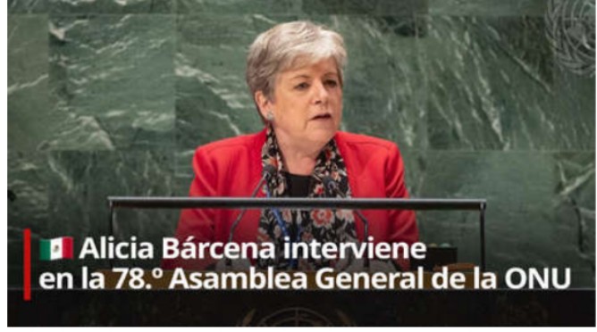 La canciller de México, Alicia Bárcena, intervinó este sábado en el Debate General de Alto Nivel del 78 Período Ordinario de Sesiones de Naciones Unidas, que se celebra en Nueva York desde el pasado 19 de septiembre.