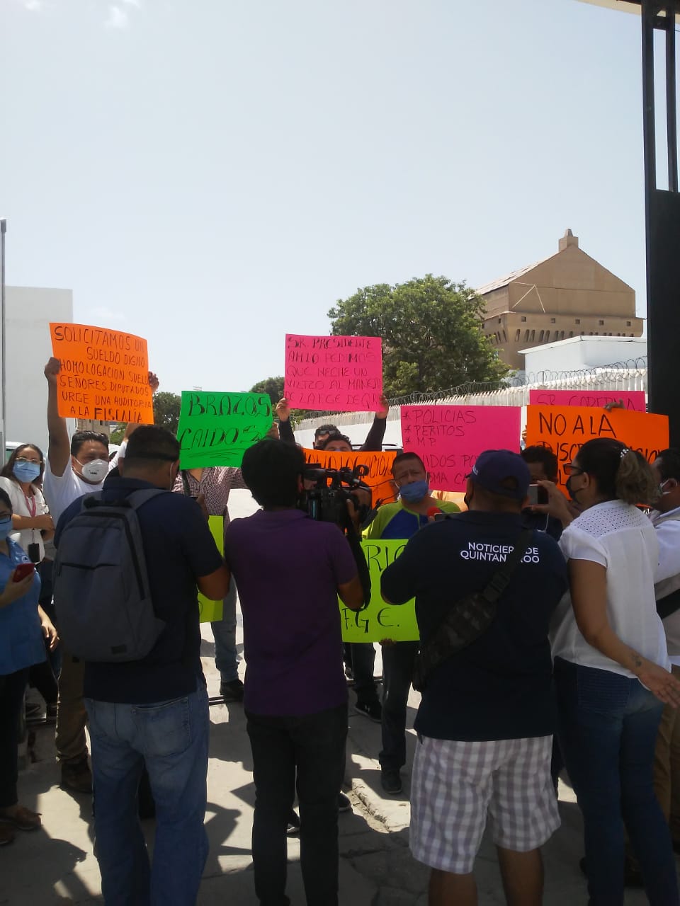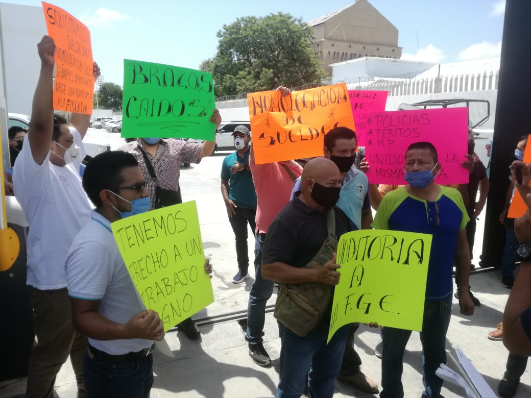 Fueron decenas de agentes de la Policía Ministerial, con el apoyo de peritos y agentes del Ministerio Público del Fuero Común, los que manifestaron en la entrada de las instalaciones de la Fiscalía General del Estado (FGE), ubicadas sobre la avenida Xcaret de Cancún, para exigir la homologación de sueldos, entre otros puntos.