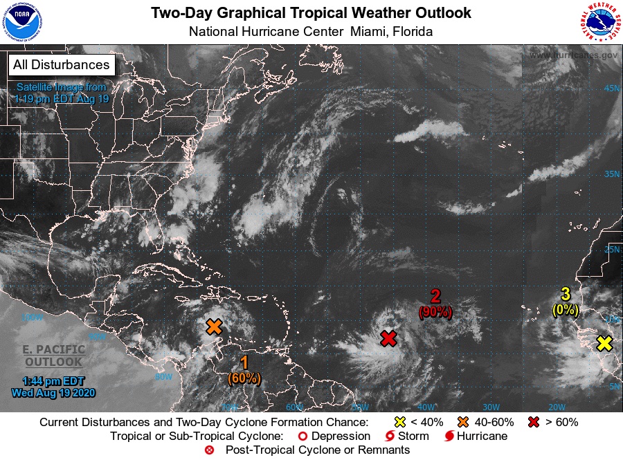 La Coordinación Estatal de Protección Civil informó, que de los dos sistemas que se encuentran en el mar Caribe, el primero es una onda tropical que mantiene un 60% de probabilidad de desarrollo ciclónico en las próximas 48 horas y un 80% en los próximos 5 días y se localiza a mil 840 kilómetros al este sureste de Quintana Roo con un desplazamiento hacia el oeste a 28 kilómetros por hora.