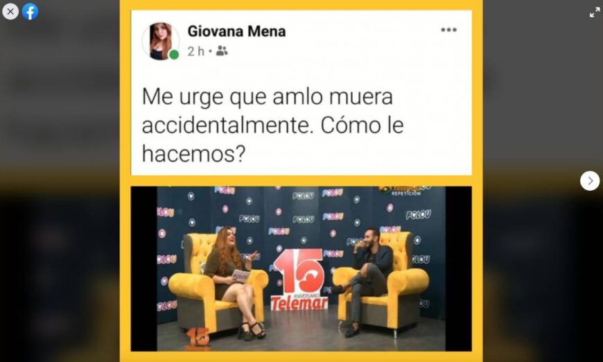 “Me urge que amlo muera accidentalmente. Cómo le hacemos?”, posteó Giovana Mena, a quien internautas identificaron más tarde como comerciante y conductora de un programa de la televisora local Telemar.