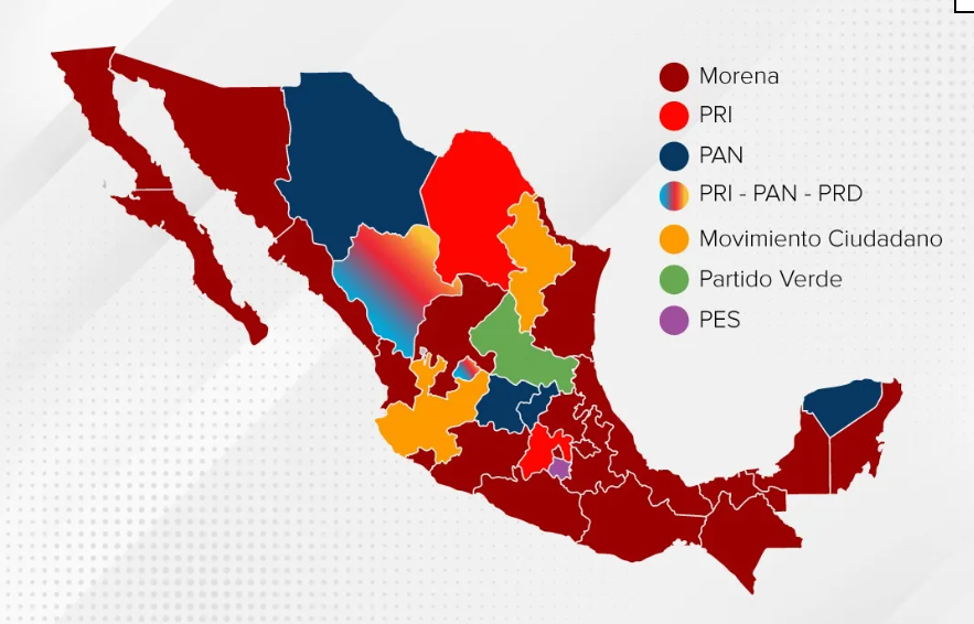 A partir de que los cuatro candidatos morenistas asuman sus cargos, Morena y sus aliados gobernarán en 22 de las 32 entidades del país, es decir, dos terceras partes.