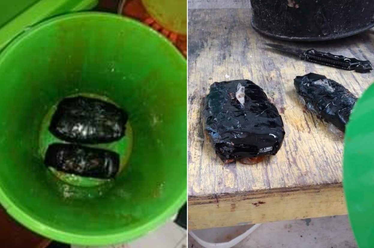 Posteriormente pasó por el filtro de inspección de alimentos, donde indicó que se le olvidaron las tortillas y unas bolsas, por lo que dejó la cubeta sobre la mesa la cual contenía comida, al ver que la persona no regresó, los oficiales procedieron a hacerle una revisión a la cubeta y descubrieron que contenía vegetal verde y seco con las características propias de la marihuana, el cual estaba envuelto con cinta de aislar de color negro.